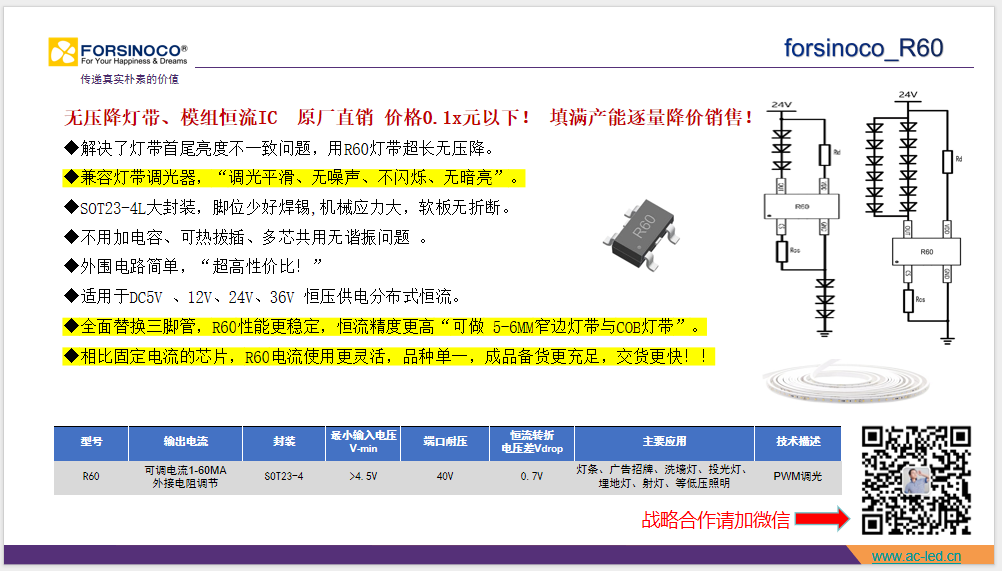 R60是一款適用于燈帶、燈條和燈板等應用的中低壓照明恒流驅動器,具有良好的抗沖擊能力和高可靠性。LED電流由連接CS腳與GND腳的電阻RCS設定,恒流精度高,一致性好,LED電流也可以使用PWM調光控制。適用于5-30V恒壓電源供電,不需要額外組件,系統結構簡單,外圍元件極少,方案成本低。